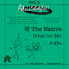 I started Adult Study Hall in October 2019 at The Native in Chicago, IL with the intention to create a kind creative co-working space in public that is welcome to creators and non-creators alike. I continued to run A.S.H. online through quarantine and then again in person at The Native after it was safe to see each other in person again. Since then I've hosted many in person nights and I've also helped to fundraise for Hope for the Day, the ACLU, El Arbol Mutual Aid group and I look forward to partnering with more local nonprofits in the future!
